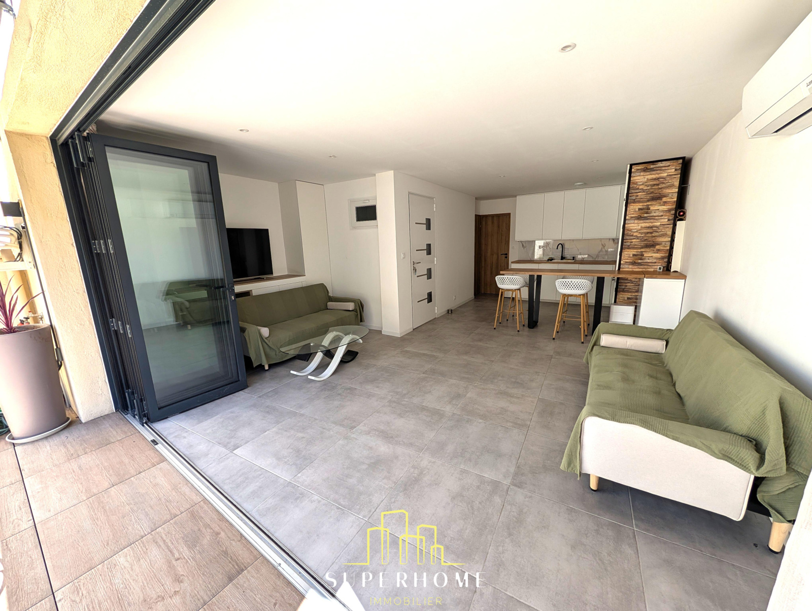 Notons que grâce a sa baie vitrée accordéon, la piece de vie s'ouvre entierement et se prolonge naturellement sur le jardin, baignant l'espace, de lumière.